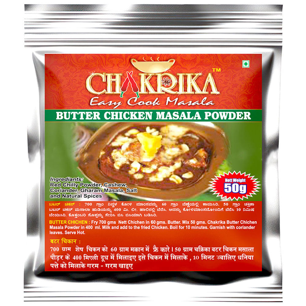 BUTTER CHICHEN: Fry 700 gms Nett Chichen in 60 gms. Butter. Mix 50 gms. Chakrika Butter Chichen Masala Powder in 400 ml. Milk and add to the fried Chicken. Boil for 10 minutes. Garnish with coriander leaves. Serve Hot.