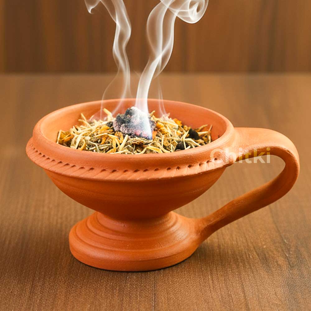 Perfect for burning Sambrani, Dhoop cups, or incense, it gently diffuses aromatic smoke that purifies your surroundings, uplifts your mood, and creates a serene spiritual ambiance. The natural clay body ensures even heat distribution, allowing the fragrance to linger longer and fill your space with divine calm.